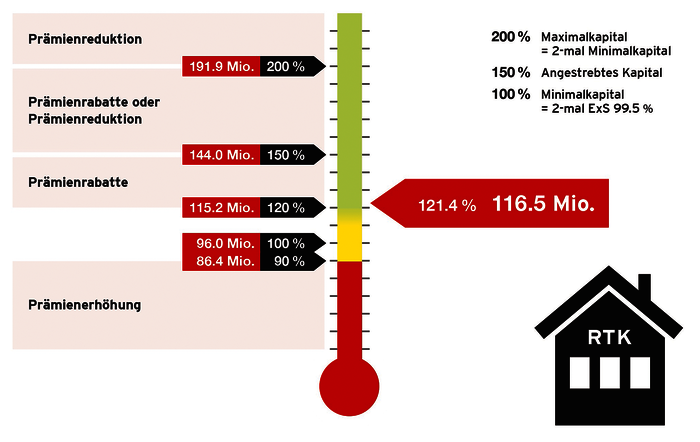 Die Assekuranz AR erfüllt, wie in den Vorjahren, die eigenen Anforderungen bezüglich Kapitalausstattung. Die Relation zwischen dem vorhandenen risikotragenden Kapital (RTK) und dem Minimalkapital ist gegenüber dem Vorjahr leicht gesunken und liegt für 2026 bei 121.4%. Die Assekuranz AR ist ausreichend, aber nicht übermässig kapitalisiert.